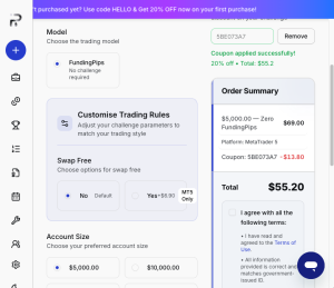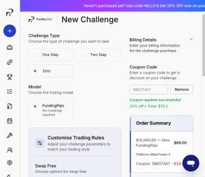 Using the FundingPips referral code 5BE073A7 gives you an instant 20% discount, making it easier to start and scale your trading journey—especially for high-value accounts up to $200K.